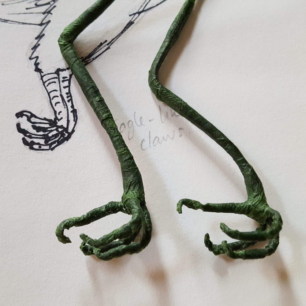 I created his talons and modelled his beak from clay (new skills learned in thread wrapping the wire and using oven baked clay)
