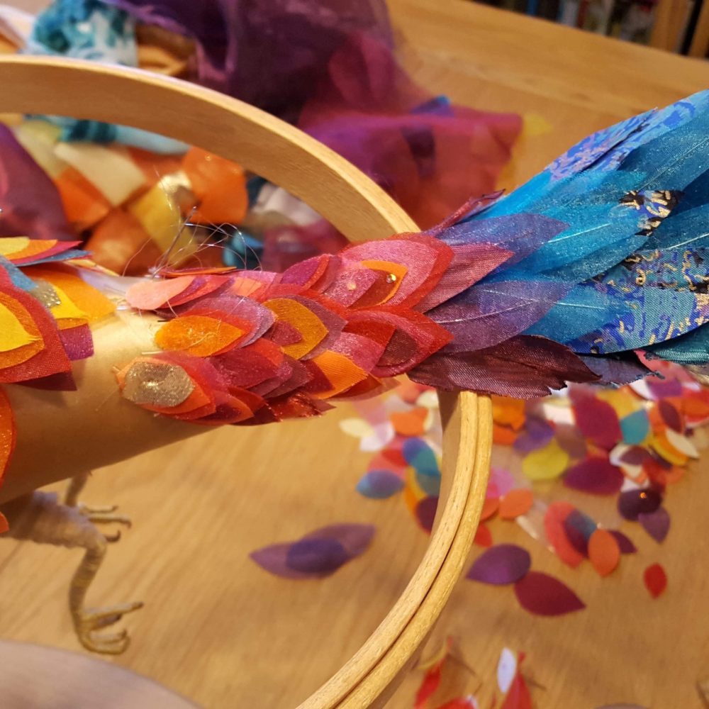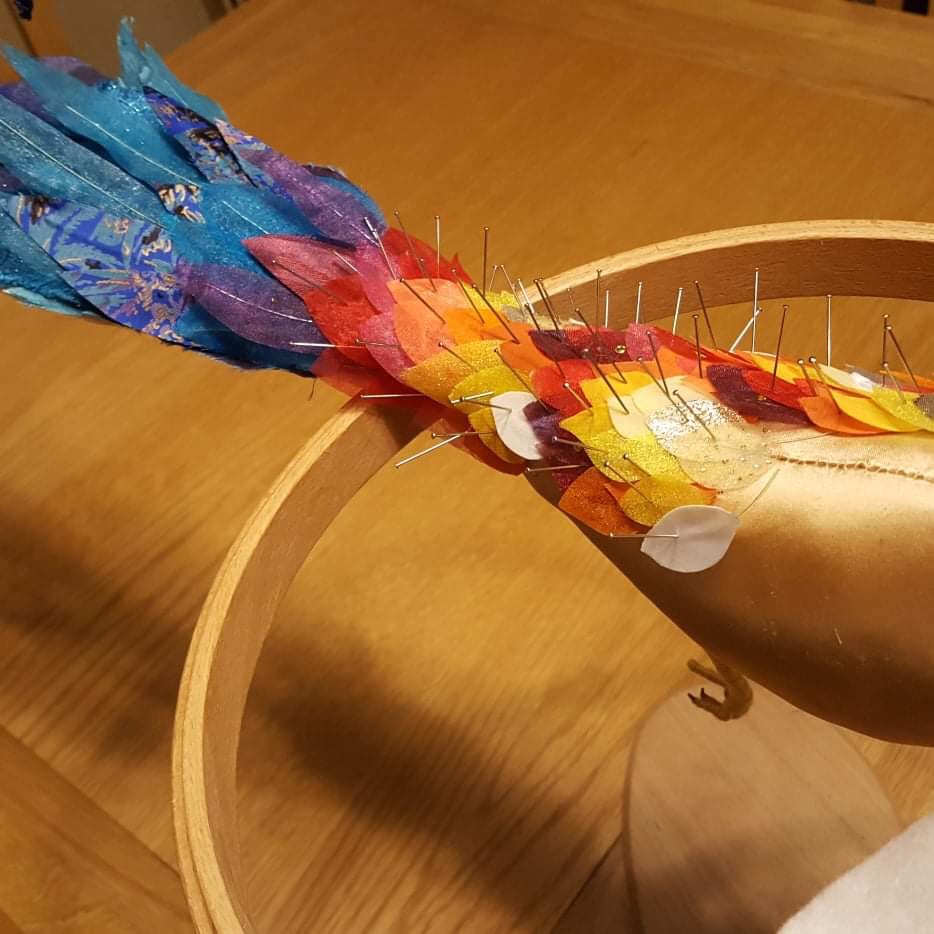 I began stitching the first flame feathers in place, much to Princess Sophia’s relief. I’m sure she had begun to think she’d never get a decent covering of feathers.