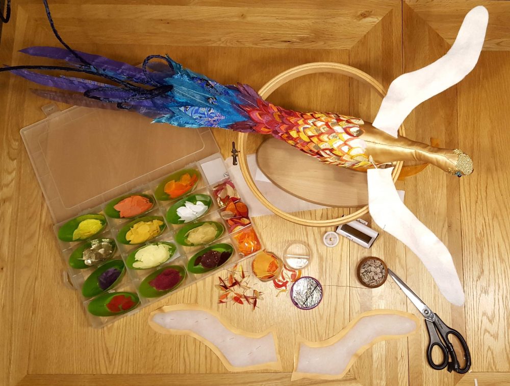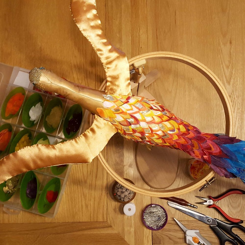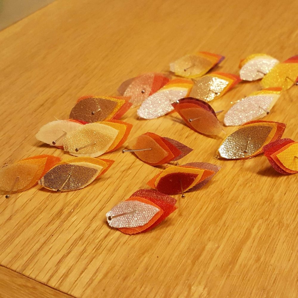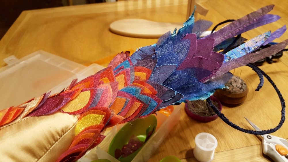 I stupidly managed to burn myself cooking a roast dinner for the family to share before they headed off home. Several hours of cold water treatment for blistered finger tips wasn’t enough to allow me to sew. However, I was determined not to miss a single day of my project, so I spent my hour awkwardly assembling feathers ready for attaching instead.