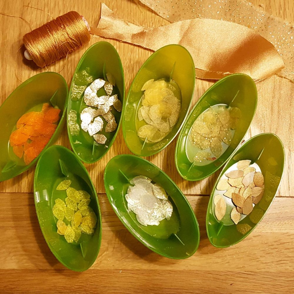 I had a very enjoyable, if a little late, creative hour making lots of tiny golden feathers whilst watching the movie Notting Hill.