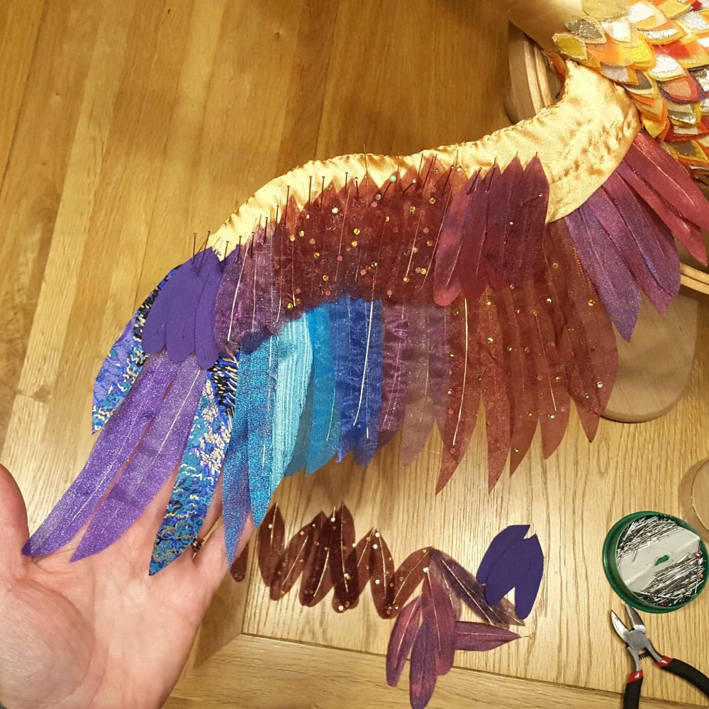 Having completed Princess Sophia’s primary wing feathers, today I began making smaller feathers, the primary coverts this time. I’ve learned so much about bird anatomy during the creation of Sophia, who knew the different layers of wing feathers had such odd names?
