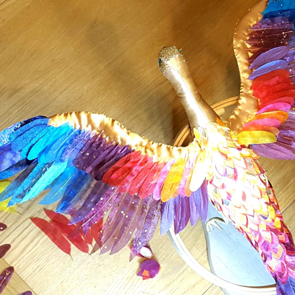 I began pinning the new feathers onto one of Sophia’s wings, but I wasn’t at all happy with the colouring – far too dark.