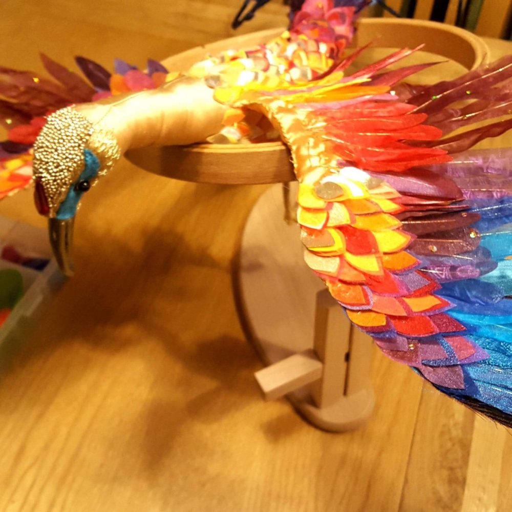 Then I set to and made masses of really tiny feathers, so small that I almost needed tweezers to hold them to sew. I worked the entire evening and into the small hours attaching them in place and embroidering the remainder.