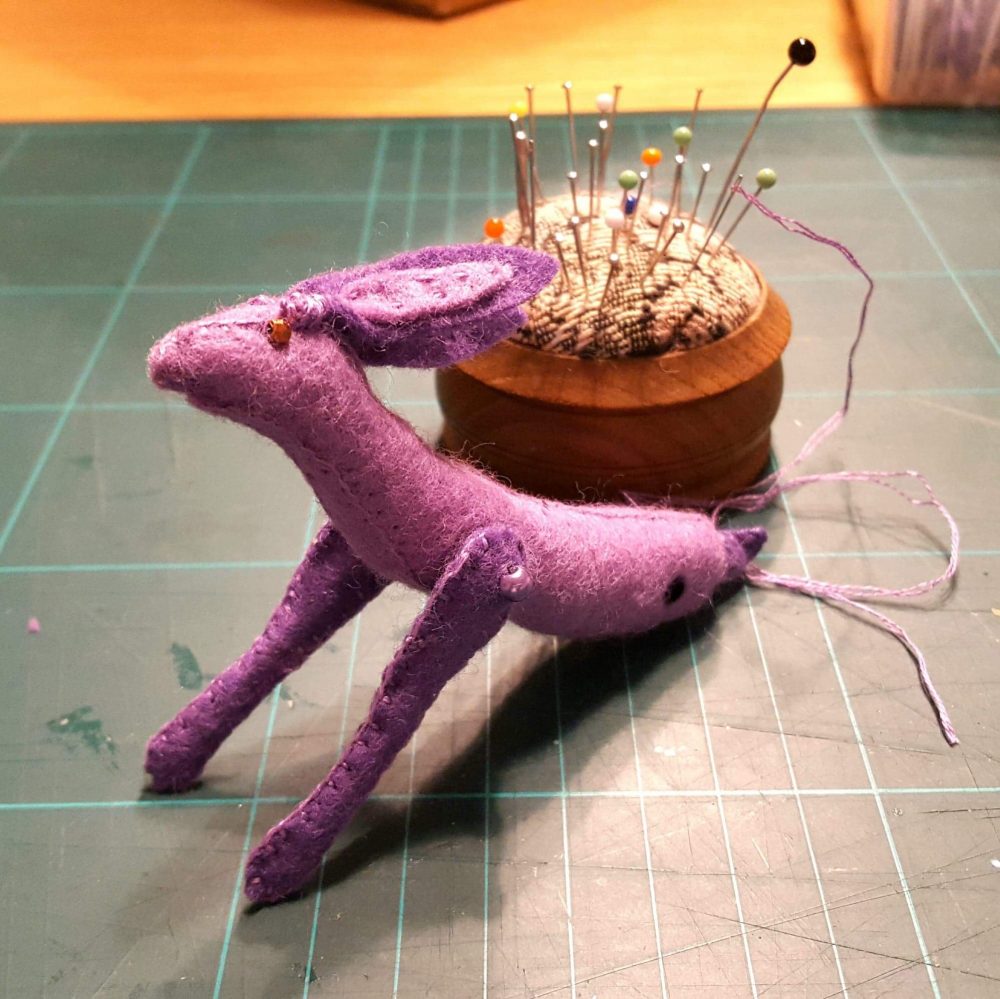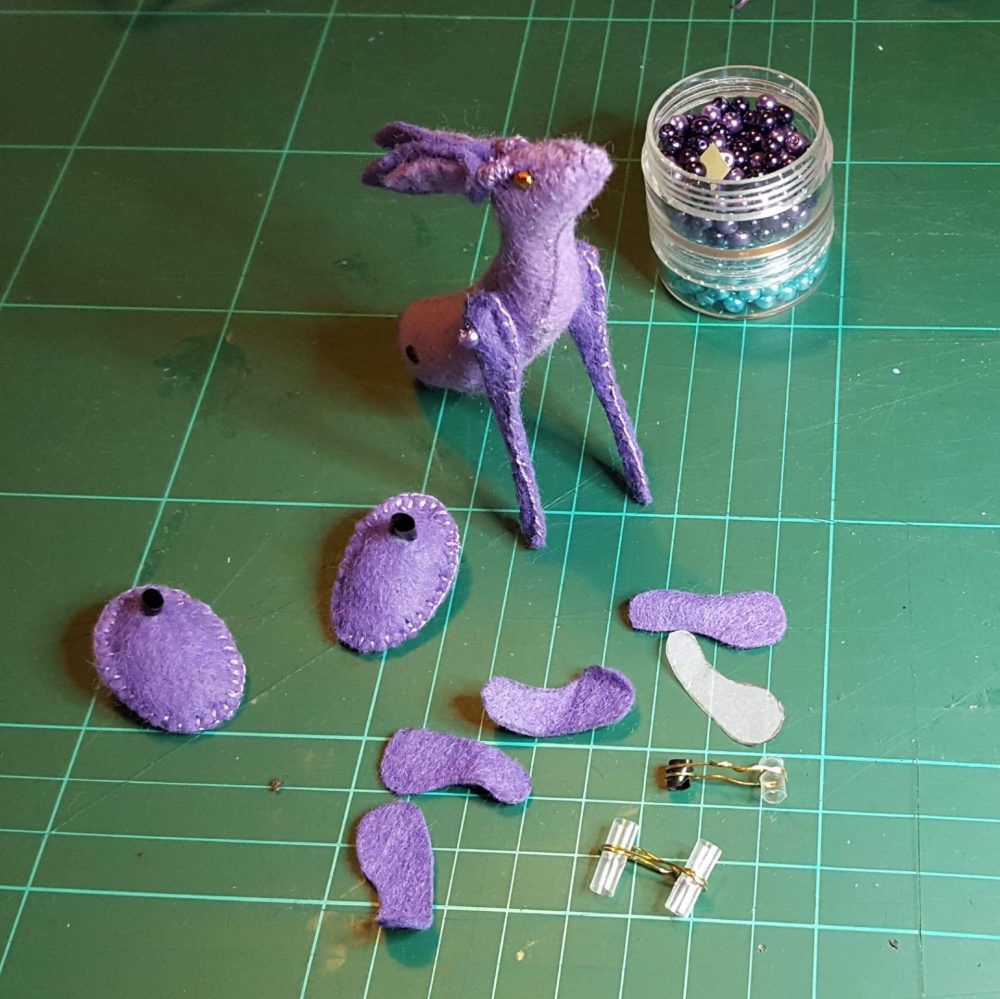 Making a tiny textile sculptured creature is so much more challenging than a large one. Whilst the construction principles remain the same, the very woven nature of most fabric is at odds with being cut into such tiny pattern pieces. The fabric frays and distorts dreadfully. This week has taught me why it is that small fabric items, like dolls clothes and miniature teddies, are often made with purpose designed or especially tightly woven, high quality fabric. Since I don’t own any fabric of this type, I’ve been making do with what I do have. Much to my frustration, I’ve resorted to using some scraps of cheap felt.